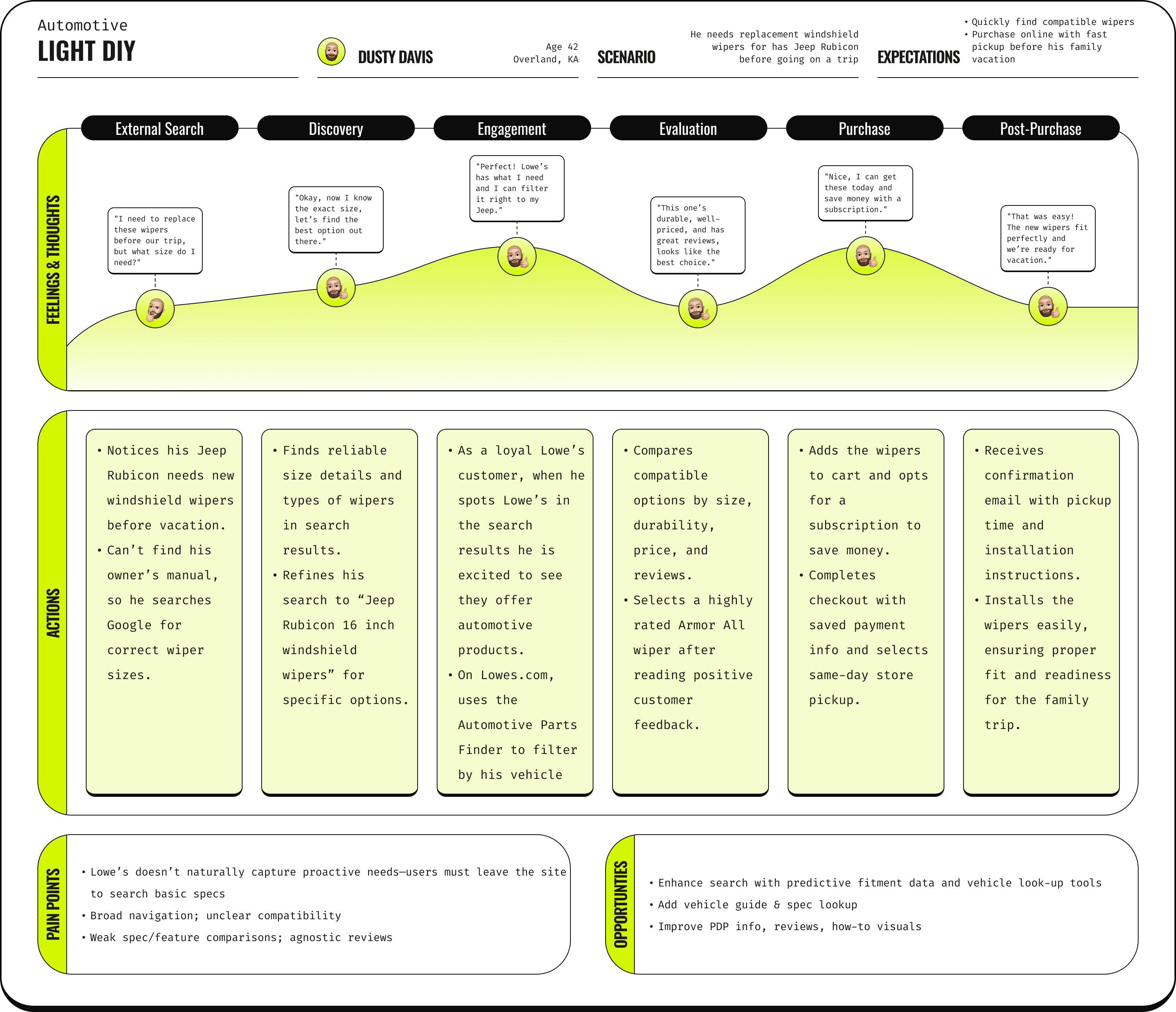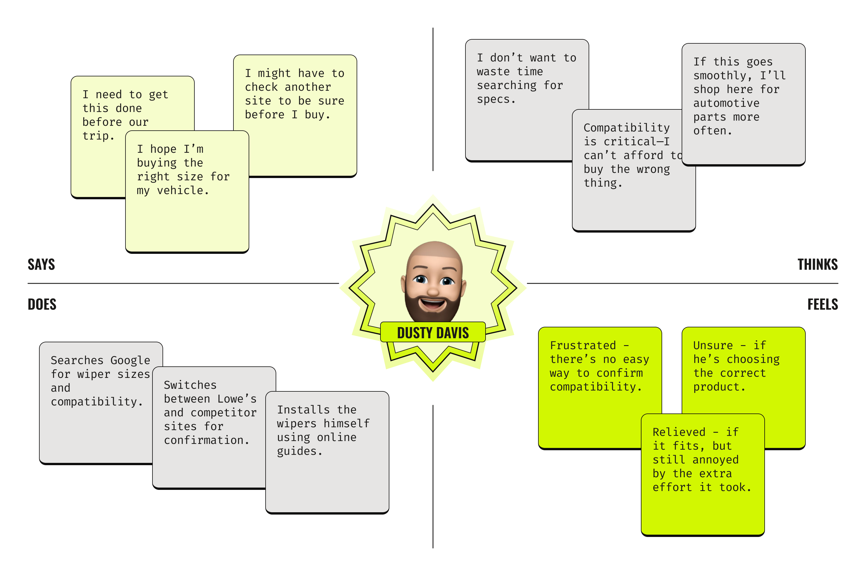 I then created an empathy map based off of the insights from our persona and his current-state journey on Lowes.com. I reviewed his actions, pain points, and emotional responses at each phase of the journey, then distilled them into what Dusty says, thinks, does, and feels. This process allowed us to capture his real frustrations, behaviors, and needs, helping identify key opportunities to improve his shopping experience.