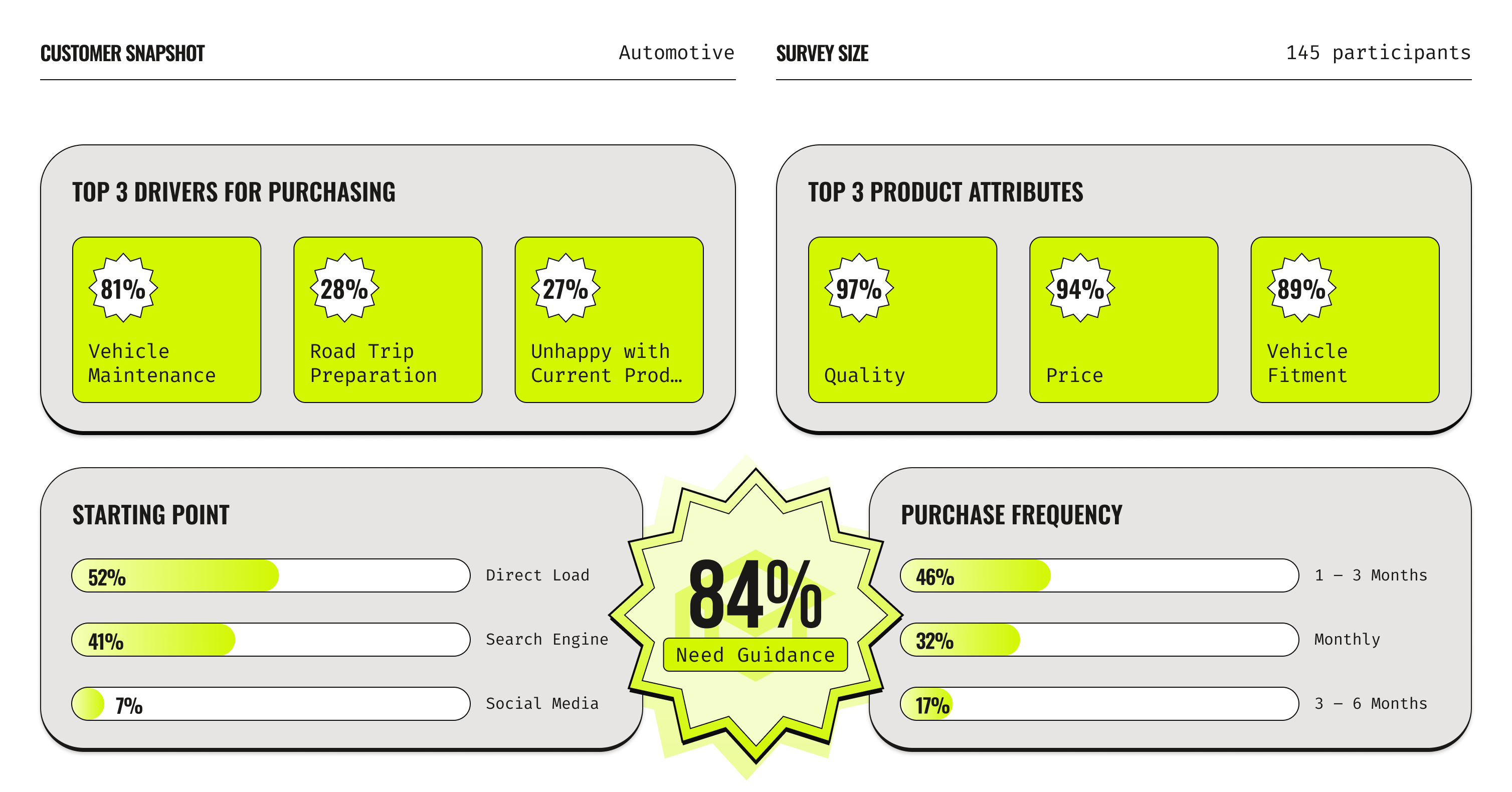 Our researcher and I started with a large-scale survey to gather measurable data on user needs, pain points, and behaviors. This helped us identify patterns worth exploring further and set a foundation for deeper research in the Discover phase.