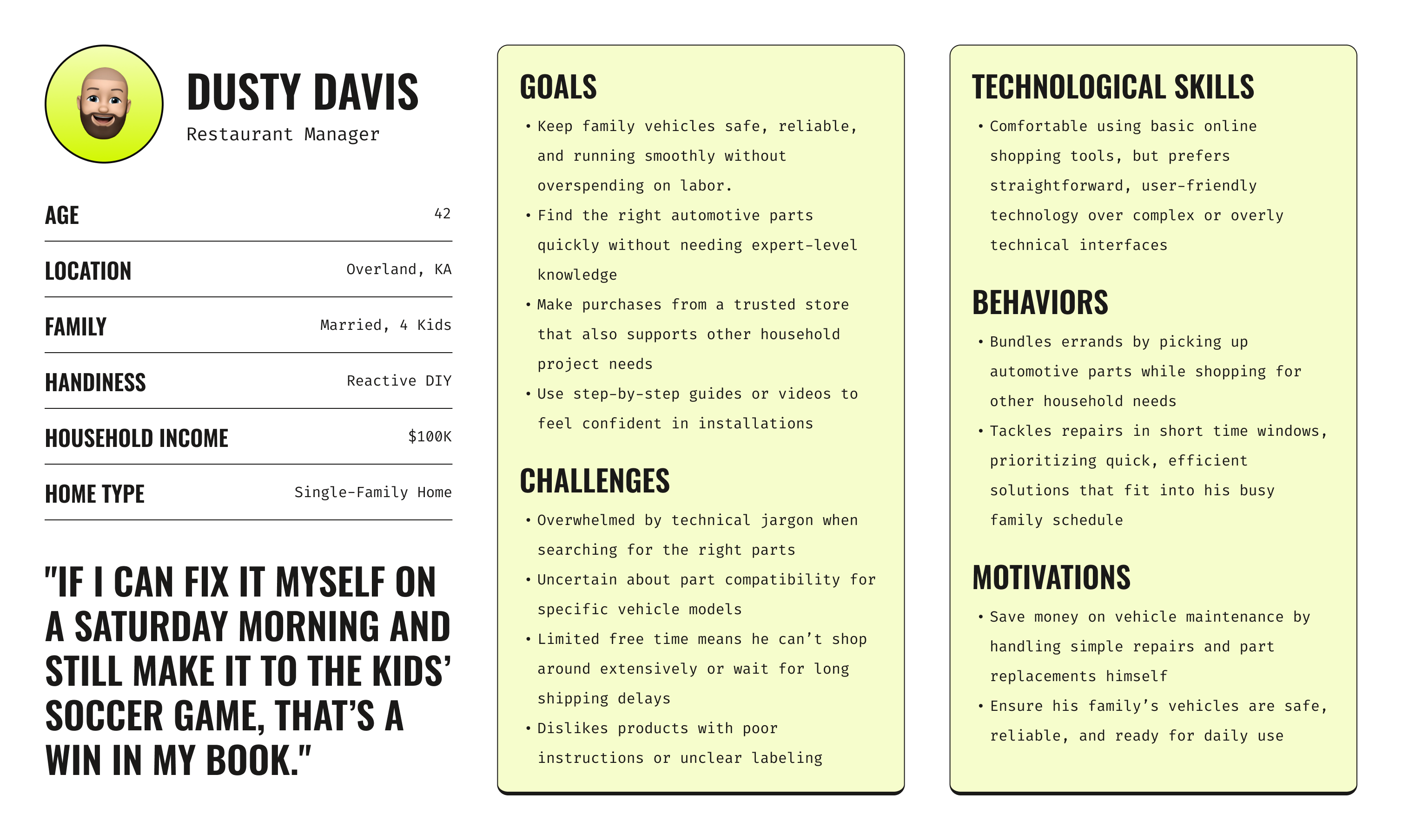 I developed a persona to humanize our research findings and keep the team aligned on a clear target user. This tool guided decision-making throughout the Define phase and into Develop.
