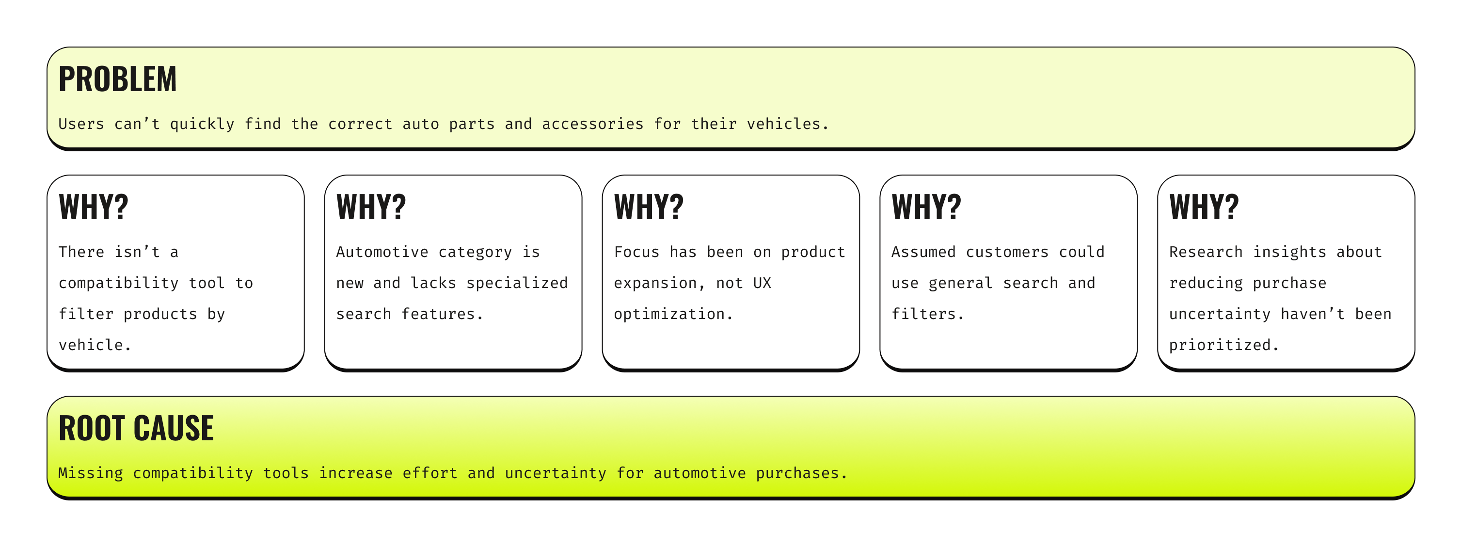 I began the Define phase with the 5 Whys technique to quickly uncover the root cause of users frustrations, ensuring our problem definition addressed the underlying issues, not just the symptoms. This helped focus our problem statement on the key barriers in the current automotive shopping experience.