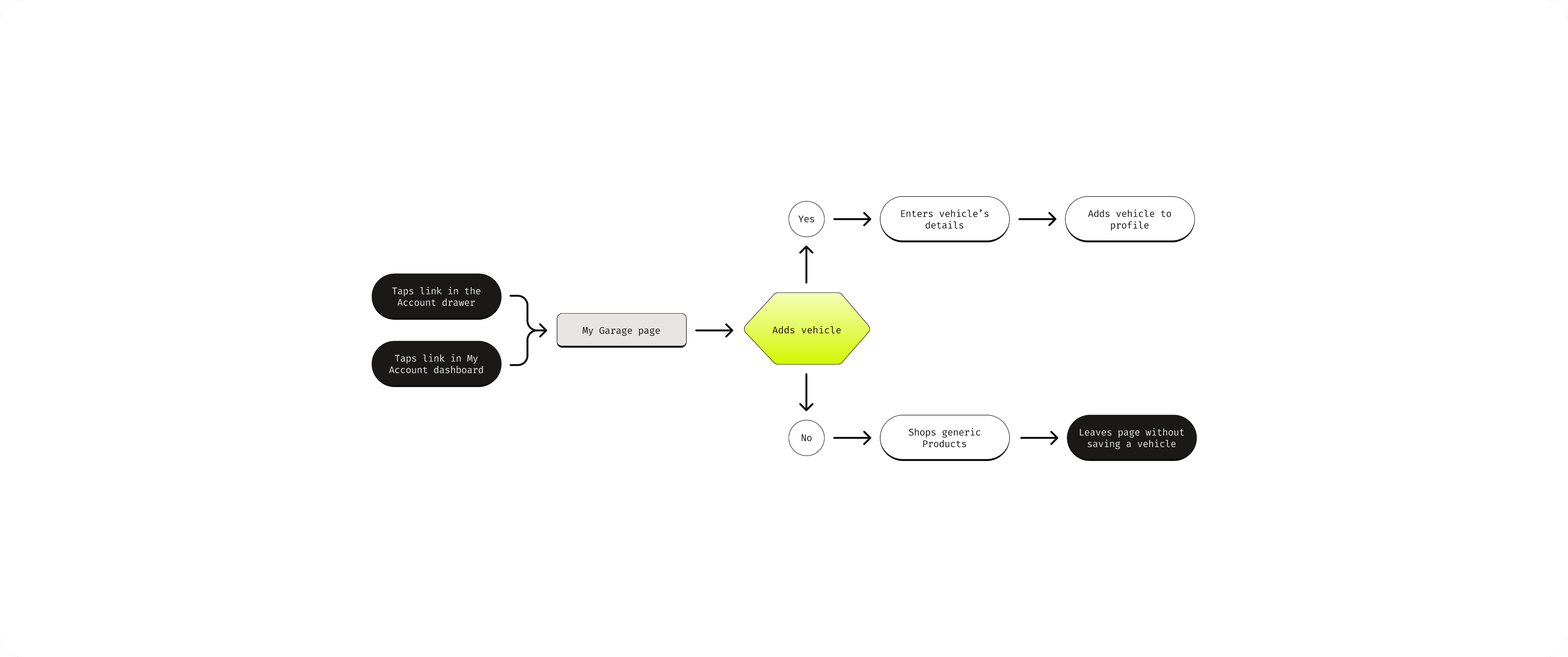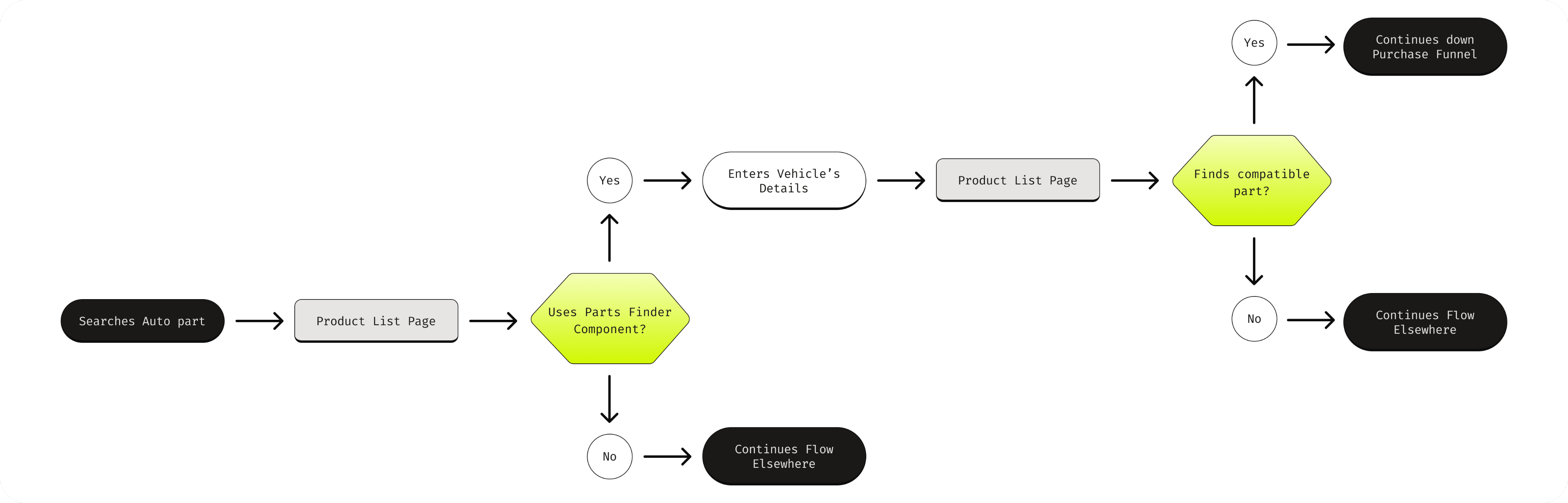 Our team synthesized research findings, behavioral data, and business constraints to clarify the core problem: customers lacked confidence and efficiency when shopping for vehicle-specific parts. To address both immediate compatibility friction and long-term retention opportunities, we aligned on designing two complementary features: an Automotive Parts Finder to streamline accurate part discovery at the point of purchase, and a persistent My Garage hub to save vehicles, personalize the shopping experience, and drive repeat engagement within the automotive category.
