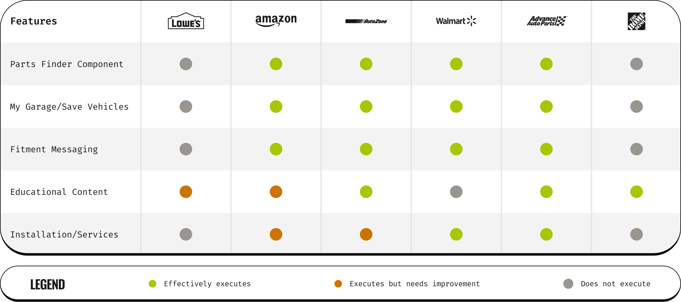 I analyzed several competitors in the automotive industry to see how similar needs are addressed in the market, identifying strengths, weaknesses, and opportunities. This provided benchmarks and inspiration for potential solutions during the tail end of Discover.